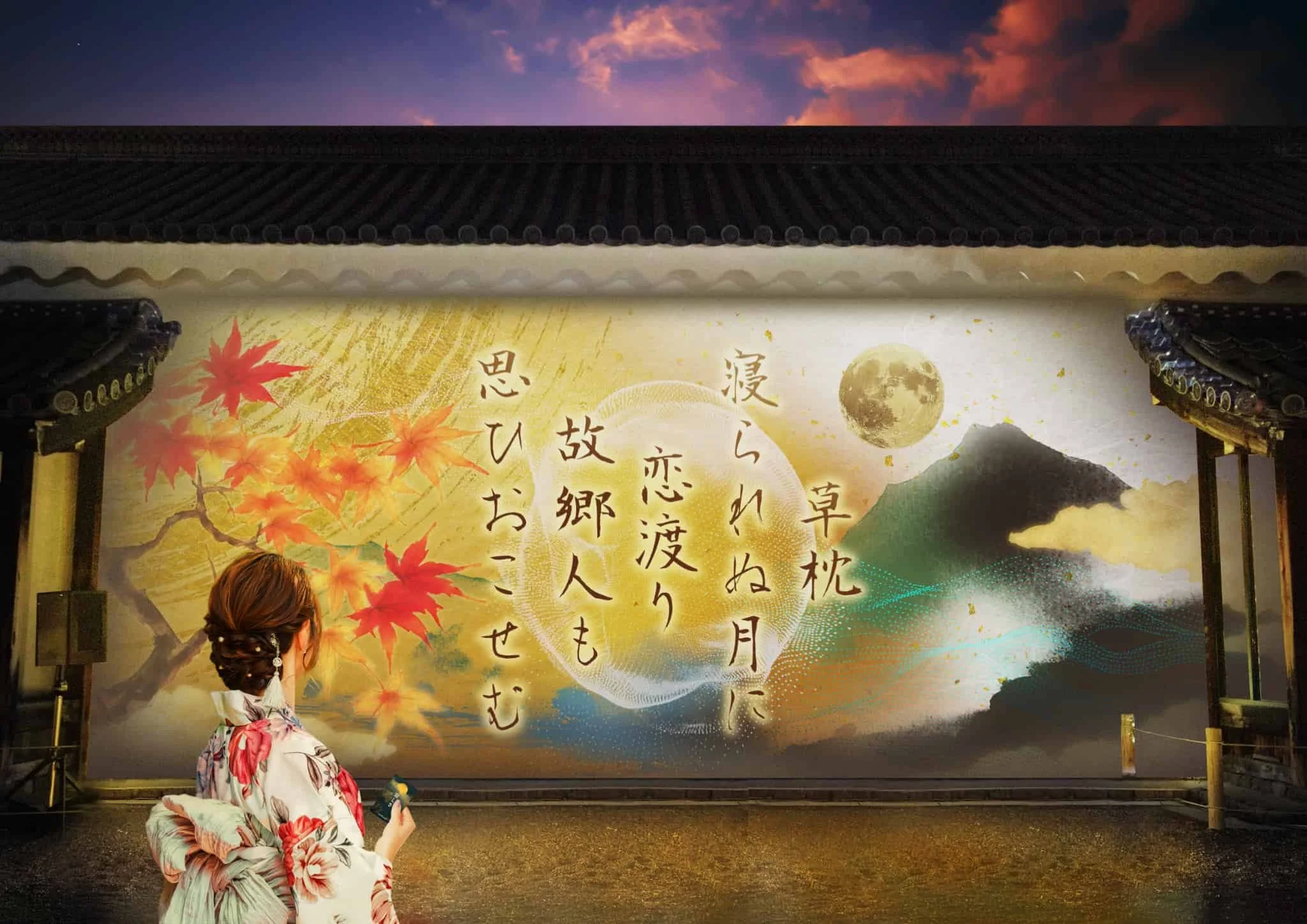 国宝・二の丸御殿 大広間前のプロジェクションマッピング。江戸の観月会を映像で再現し、現代にその文化を伝える。