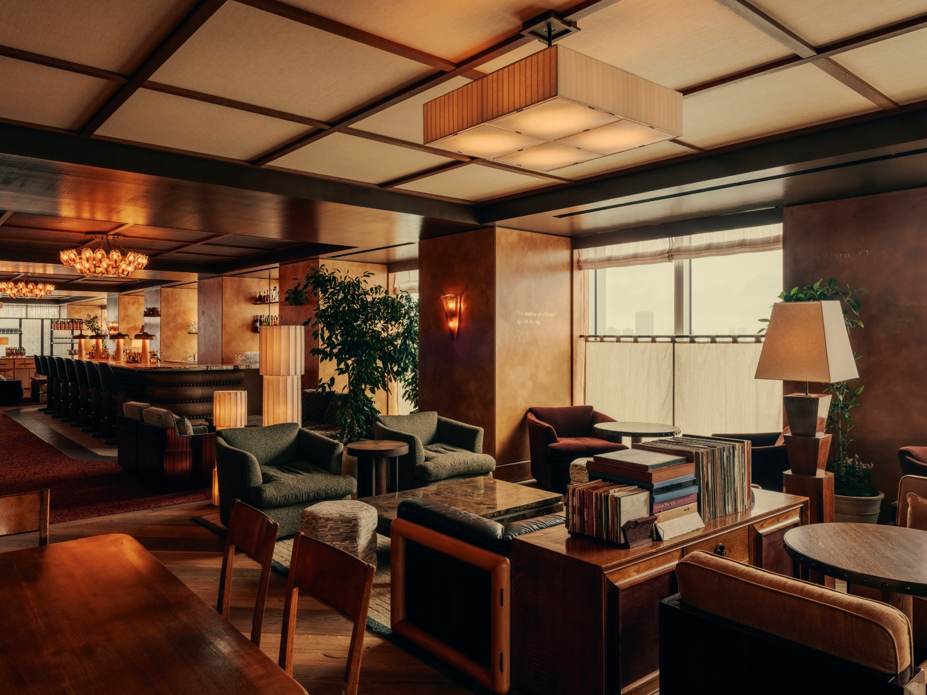 館内のインテリアは、ヴィンテージ家具が並ぶ「Soho House」らしい空間に、日本のクラフツマンシップへのオマージュを随所に散りばめた。例えば、畳をイメージした天井や、多治見タイルや和紙を使った壁、アップサイクル着物を用いたファブリックなど、日本各地で集めてきた素材が空間に奥行きをもたらす。