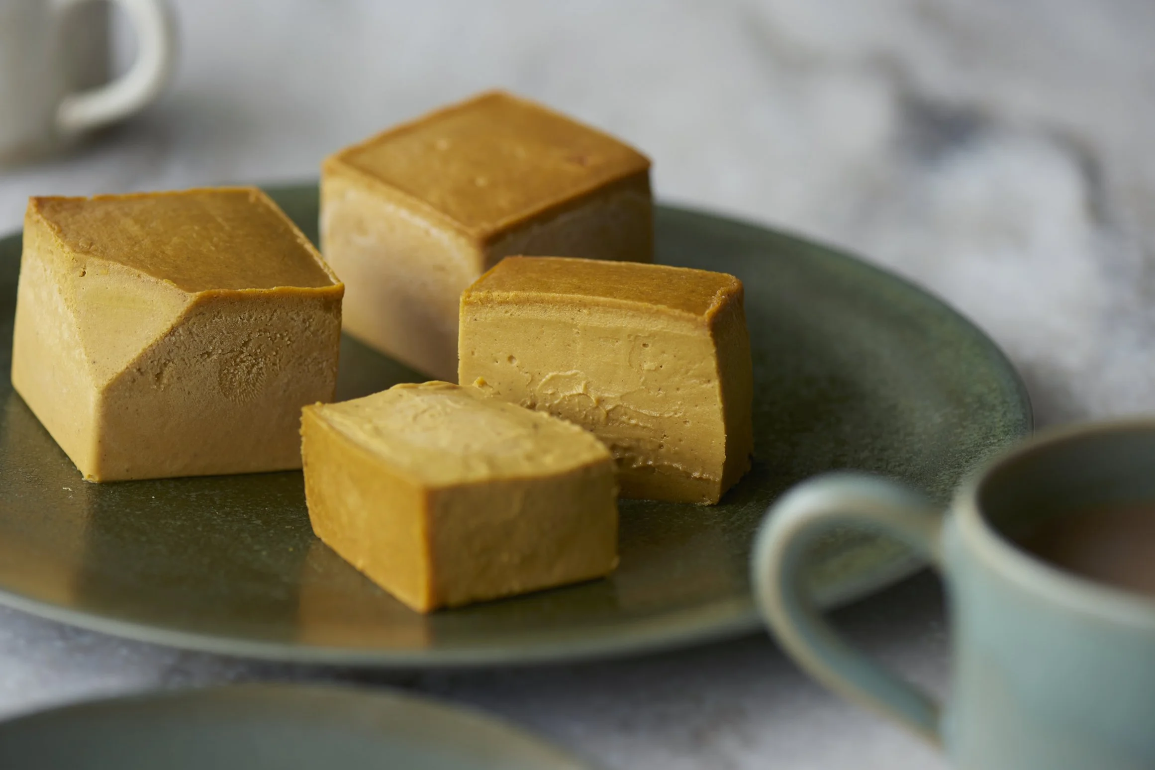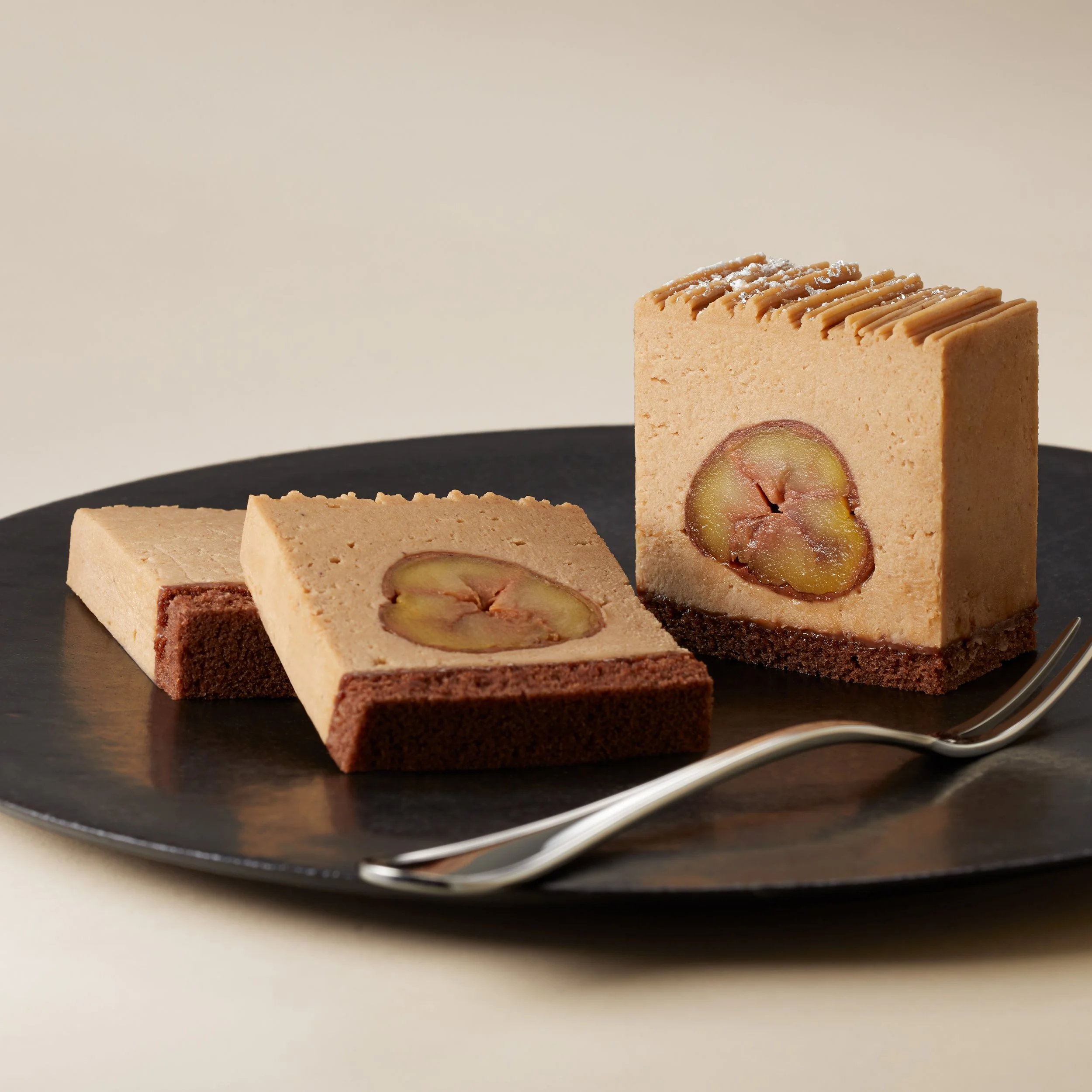 口に運べば、上品な栗の風味が口いっぱいに。洋菓子のようにも、和菓子のようにも感じられるミニマルな “正方形”は、秋の贅沢そのもの。