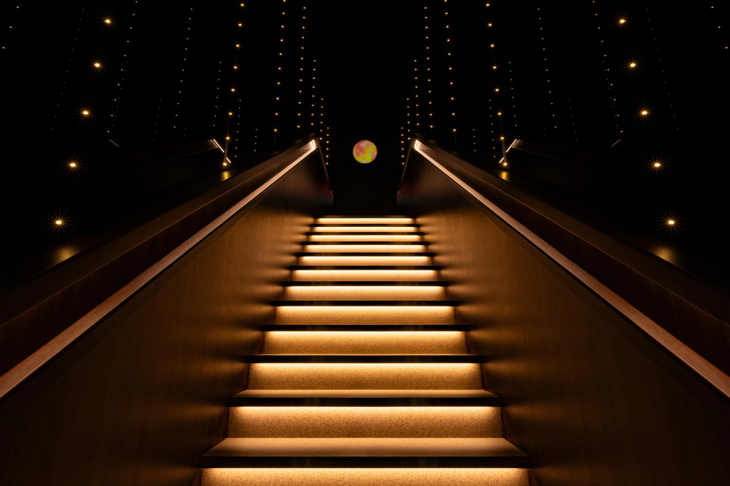1階と2階を繋ぐ階段は、キャバレーのようなムード。その先には「もし赤坂の惑星があったら?」をコンセプトに赤坂の地形を球体にマッピングした、グラフィックアーティストYOSHIROTTENによるアート《PLANET A》が飾られる。