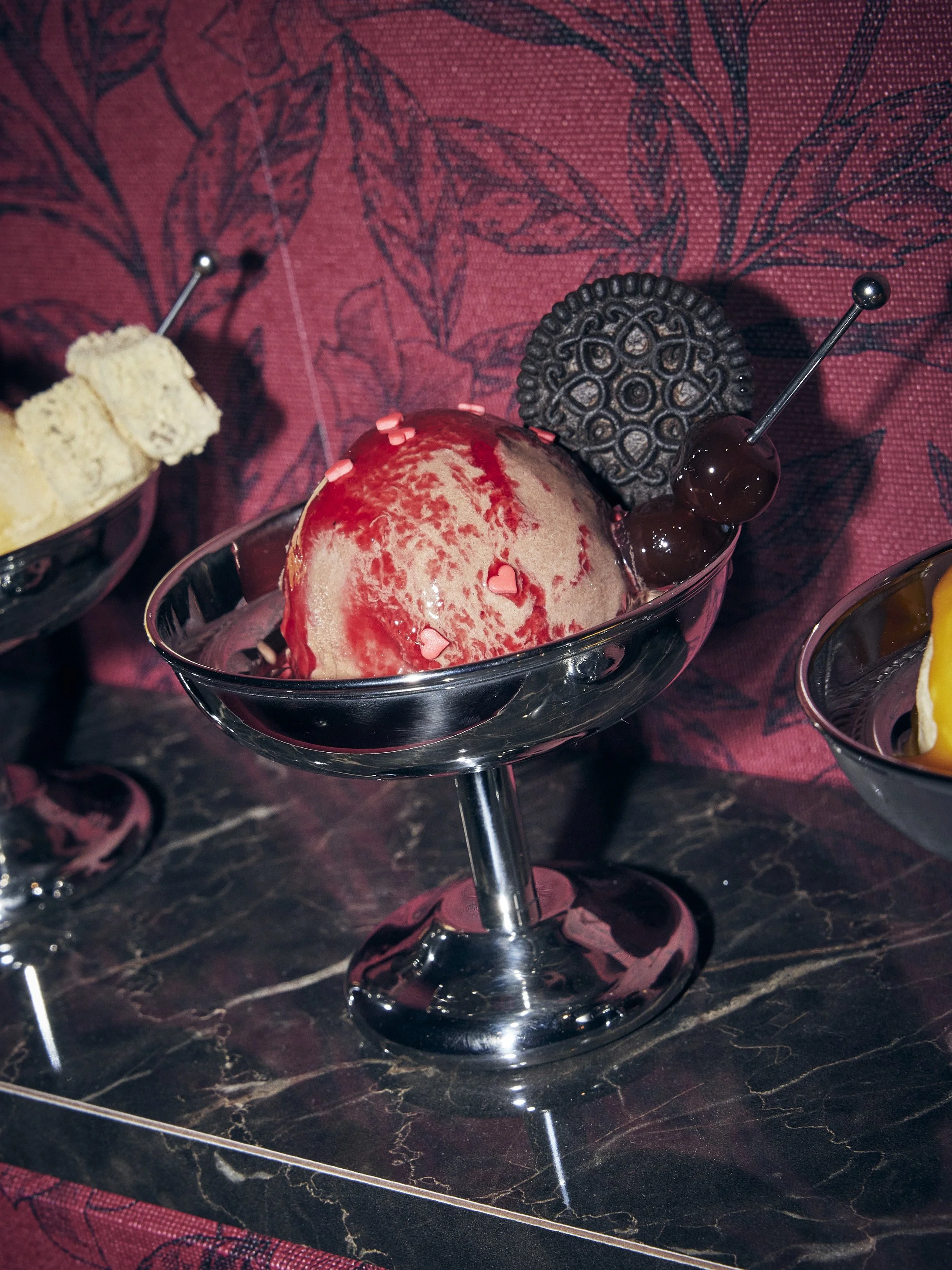 〆のスイーツには、アイスクリームも用意されている。スナックを象徴する“ルージュ色”の〈チョコレート/ベリー〉や〈バニラ/黒蜜きなこ/わらび餅〉、〈バニラ/マンゴーパッション〉の3種からお好みを。
