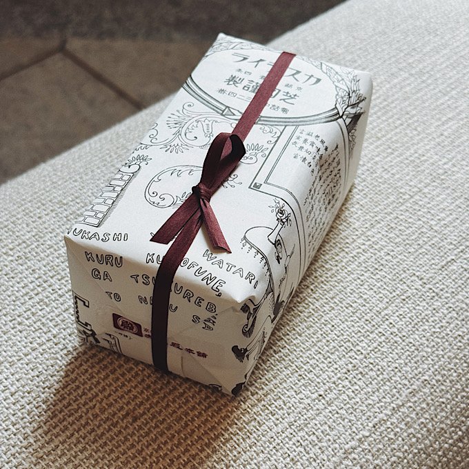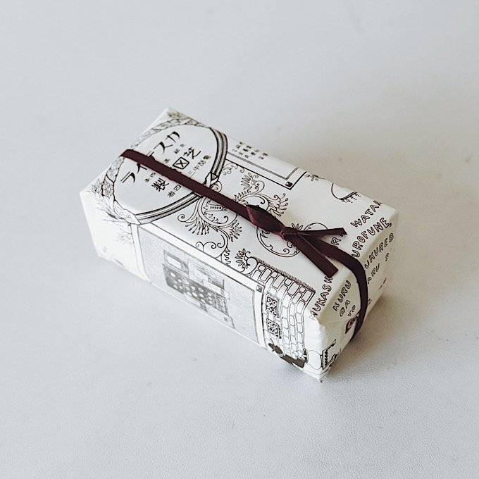 そして、一目惚れした包装紙。茶色の掛け紐とのバランスも含めてとても美しい。レトロでハイカラな包装紙は大正時代にデザインされた図案を復刻したもので、カステラの言われや効能なども記載されていて読んでも楽しめる包装紙です。