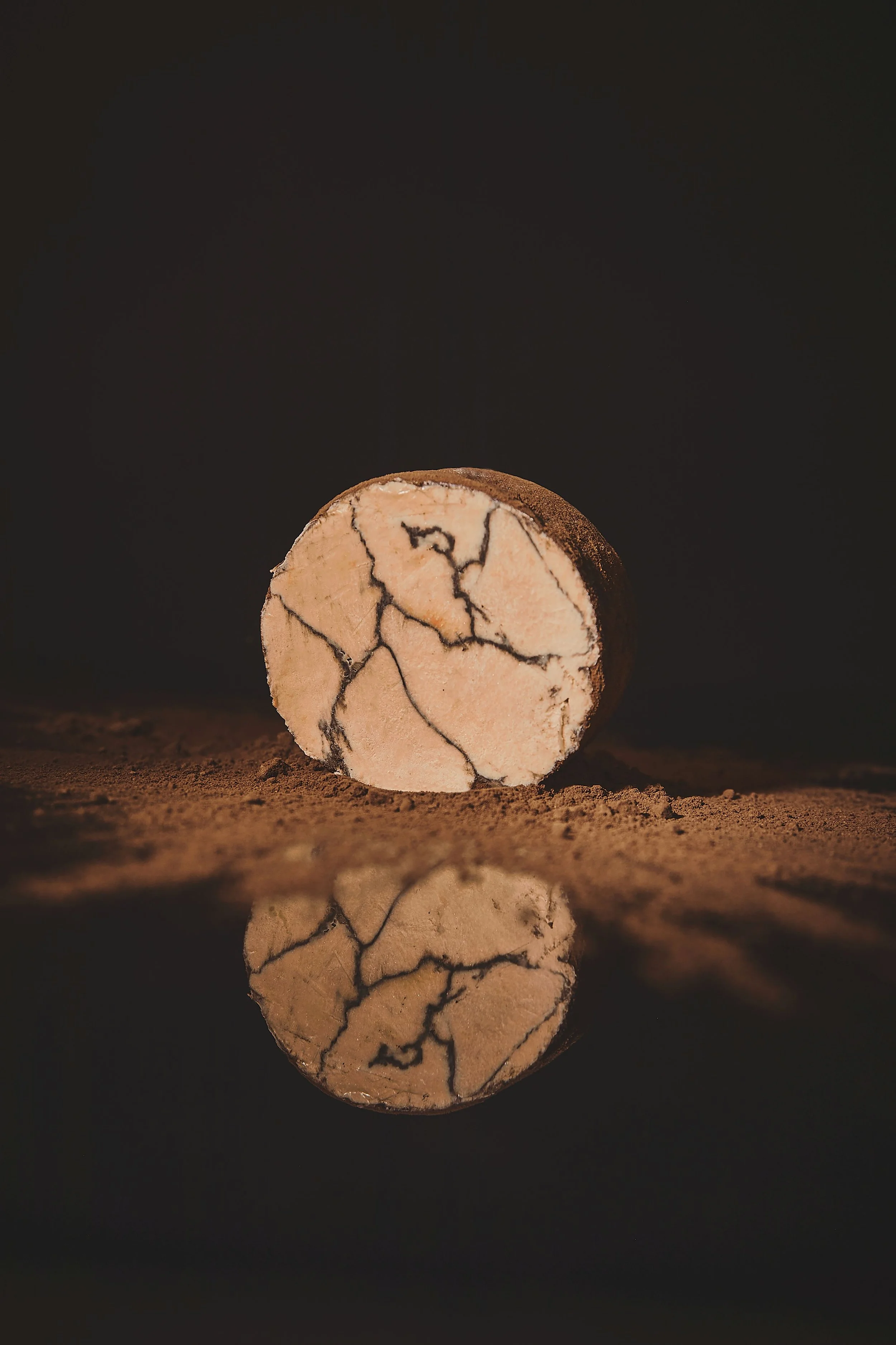 カカオパウダーを巻き込んだフォアグラを丁寧に火入れし、なめらかな口どけに仕立てたテリーヌ。甘酸っぱいフルーツジャムと香ばしいブリオッシュを添え、繊細な香りと濃厚な旨みを引き立てた贅沢な逸品。