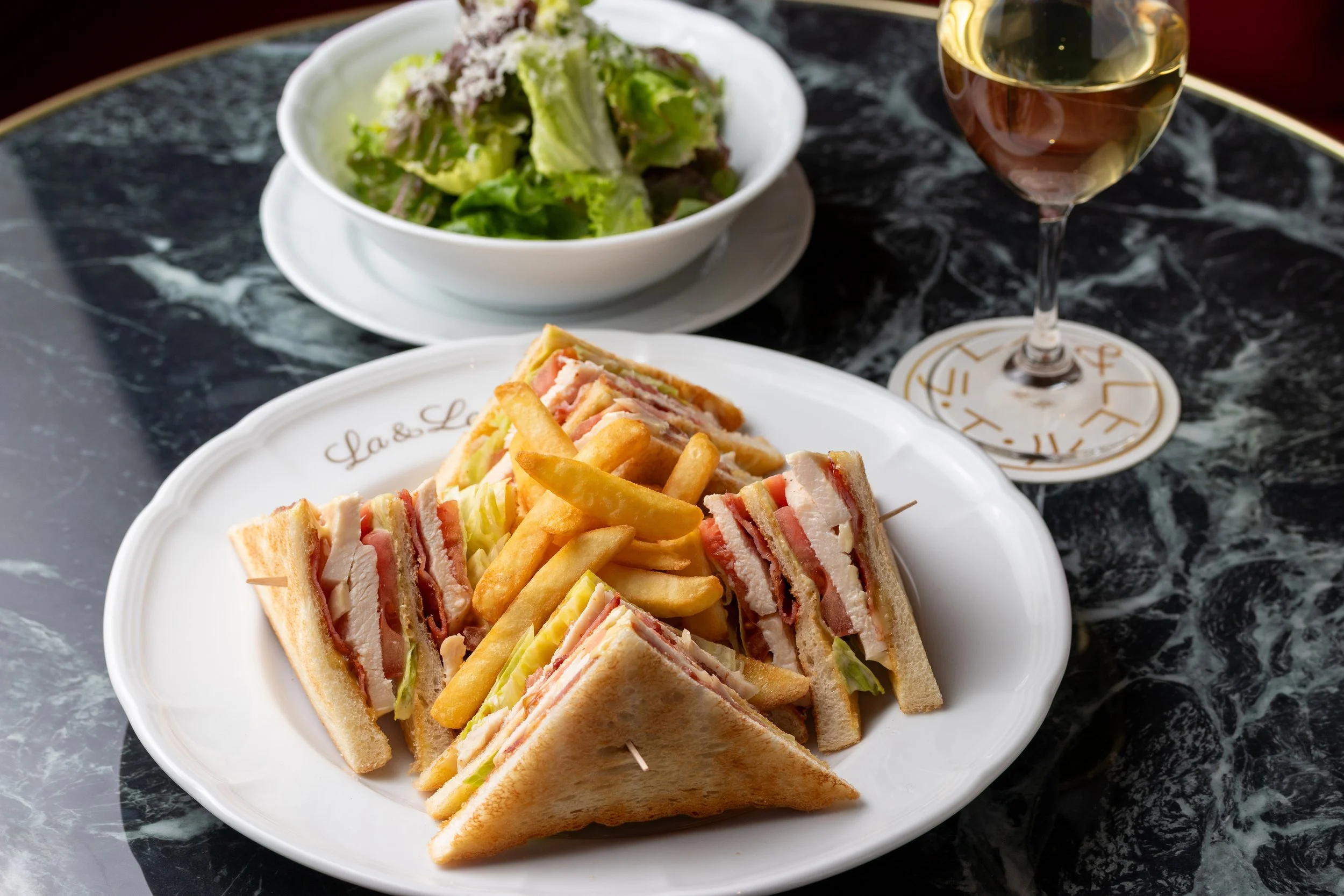 店内では、「サーモンのマリネ」や「サラダLA&LE」をはじめとする前菜から、ランチタイムにふさわしい「クラブハウスサンドウィッチ」や「海鮮のクスクス」など、パリと洋食のエッセンスを重ねた料理を朝から晩まで楽しめる。