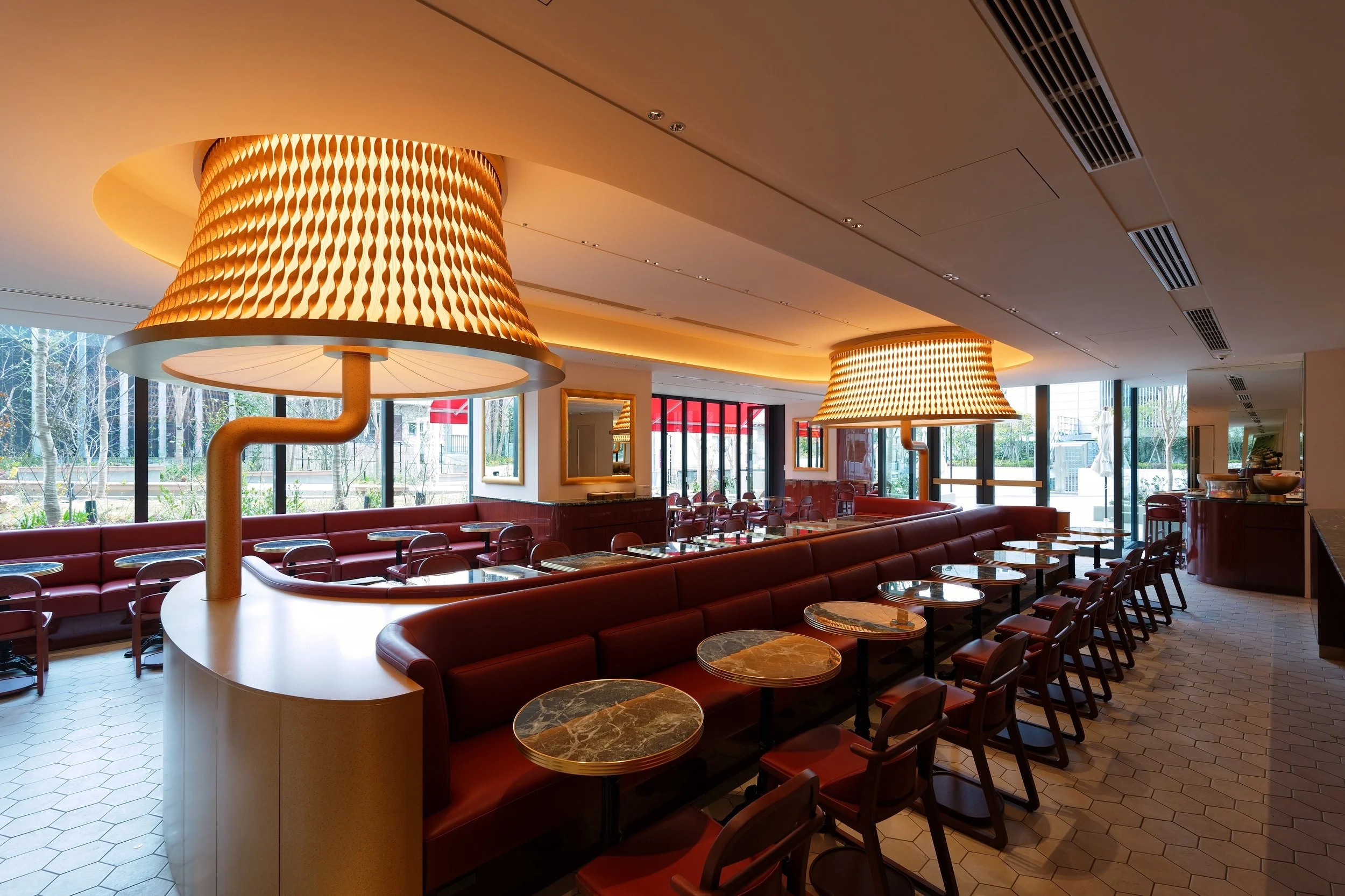 店内は、「Café de Flore」が140年かけて築いてきた美学への敬意を基盤にしながらも、単なる再現ではなく、現代の東京・青山という文脈の中で昇華した。赤を基調とした椅子とソファーが並ぶ空間は、クラシックな佇まいに東京らしい洗練を重ねた。中央では、パリが“光の都”と呼ばれる由来にもなった街灯「lampadaire(ランパデール)」から着想を得た照明が存在感を放つ。
