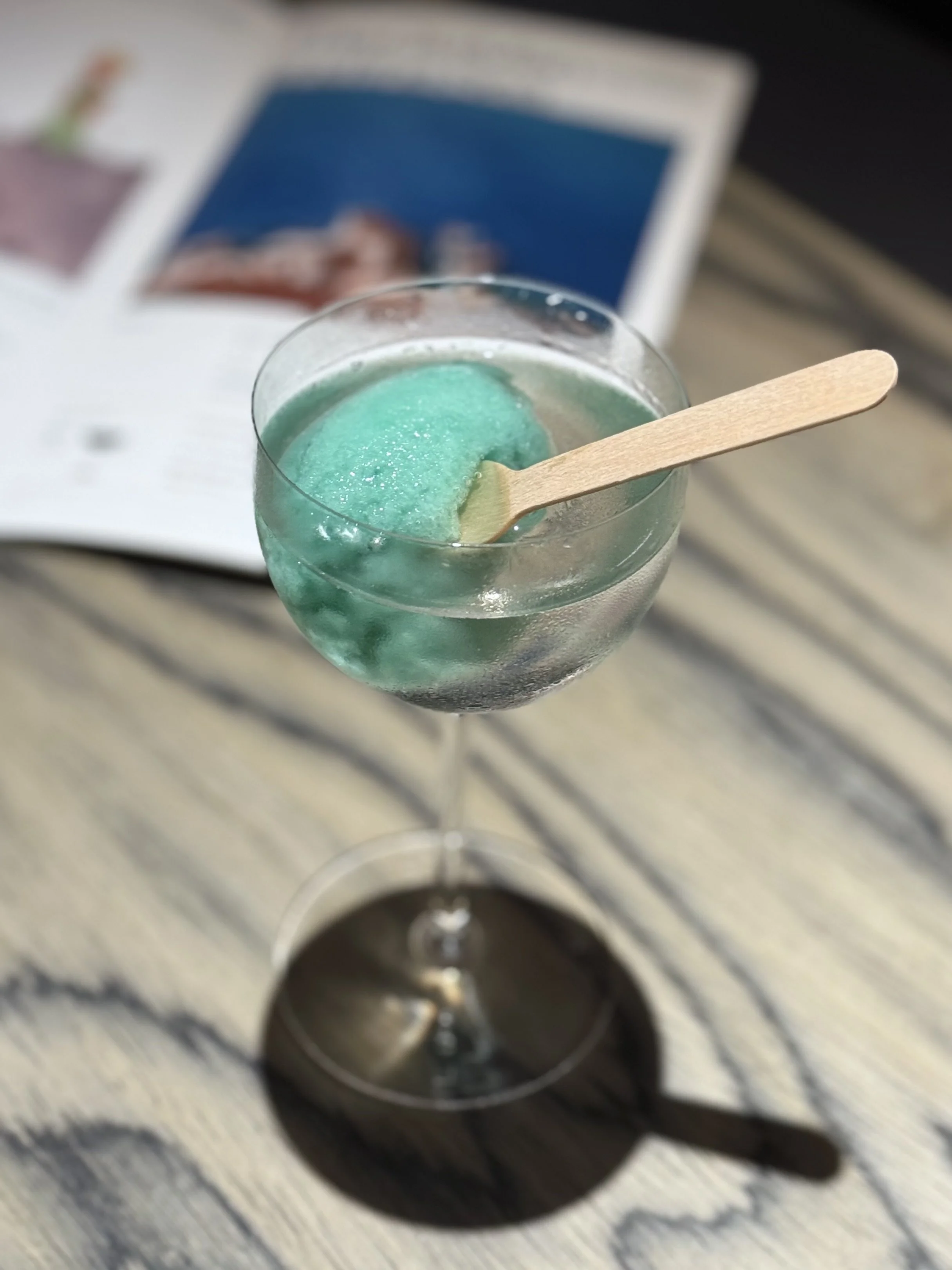 言わずと知れたアーネスト・ヘミングウェイの代表作。フローズン・ダイキリをこよなく愛した作家としても知られるヘミングウェイの物語から生まれた一杯は、彼が過ごしたキューバの海をイメージした。ラムをベースとした透明な液体の中に浮かぶミントブルーのピーチソルベが、ゆっくりと溶けながら深いブルーへと変化する。甘さを抑えたシャープな味わいと、グラスの中で移ろう色彩。海苔を漬け込んだベルモットが、ほのかに磯の香りを漂わせ、新しいかたちのフローズン・ダイキリとして作家の記憶を呼び起こす。