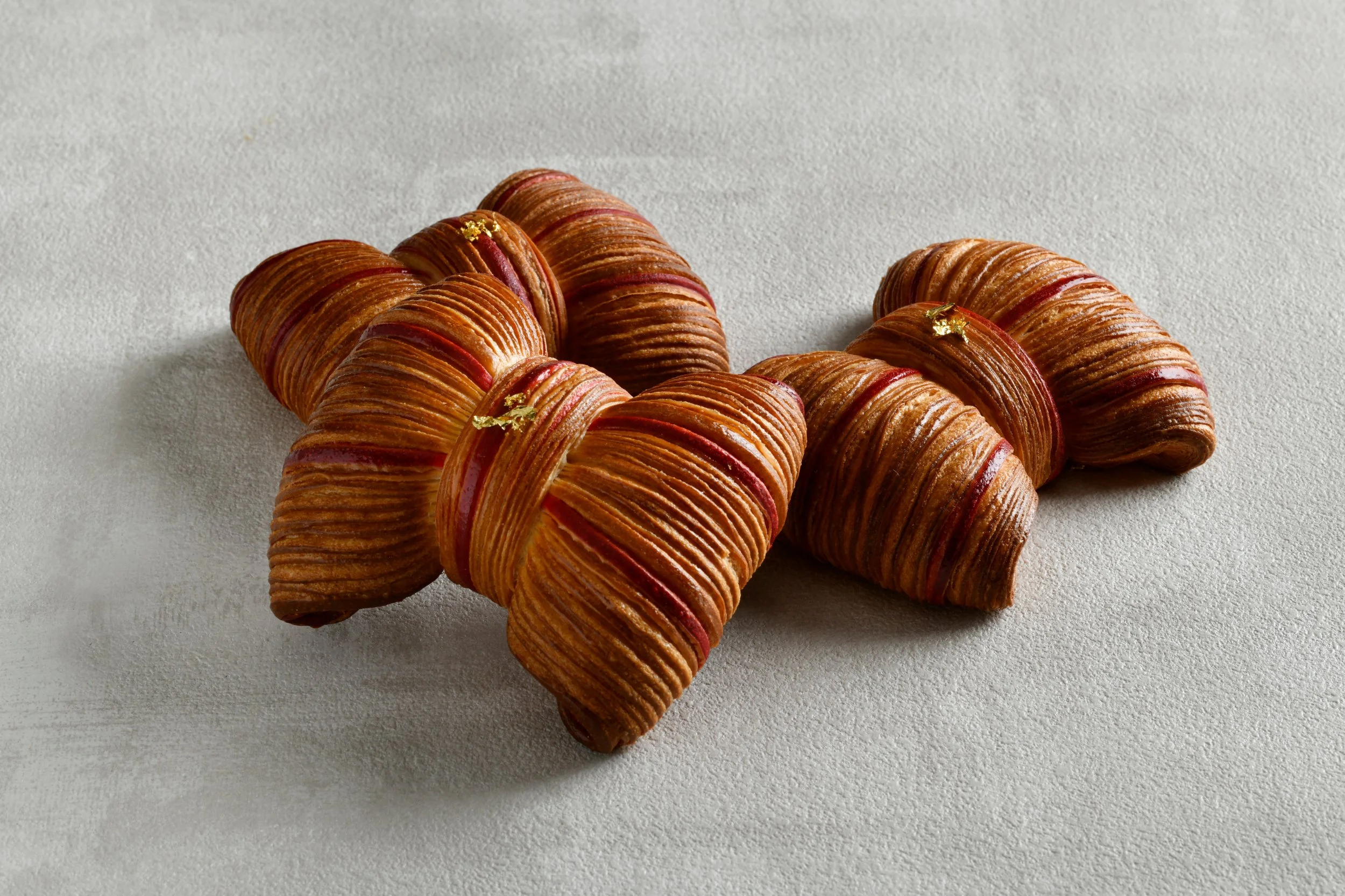思わず目を奪われる新作は、真っ赤なラインをアクセントに添えた可憐なリボン型デニッシュ。何層にも折り重ねたクロワッサン生地の中には、濃厚なキャラメルガナッシュがたっぷり。香ばしいバターの香りとともにサクサクと軽やかな食感となめらかなガナッシュのコントラストを楽しめる。