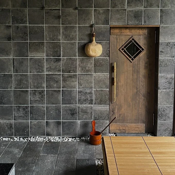 サウナ好きとして、浴室サウナにかなり期待値をあげて伺ったのですが、結果は想像以上。美しいタイルに、木の香りが漂う浴槽。2つある浴槽の1つは水風呂で、サウナ時の水分補給に水飲み用の蛇口や竹製のコップも用意されていました。