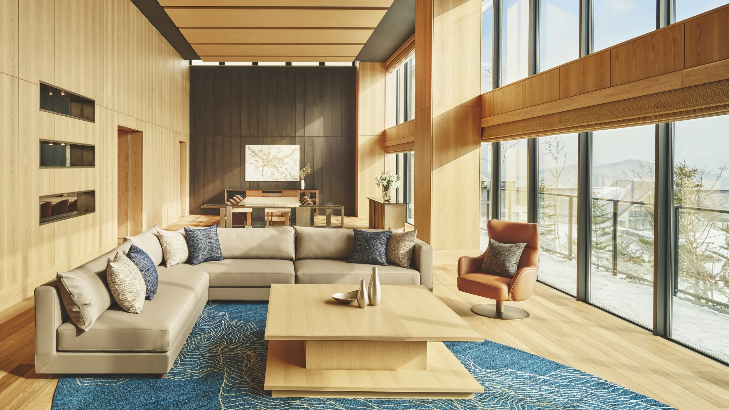 高原リゾートらしい開放感と落ち着きを併せ持つ空間には、和紙をあしらったヘッドボードや、雲や朝焼け、幻の絶景とも称される「ドラゴンアイ」をモチーフにした曲線的なフロアラグを配置。さらに、四季折々の安比の自然をイメージした色調のインテリアが、周囲の景観との連続性を感じさせる。