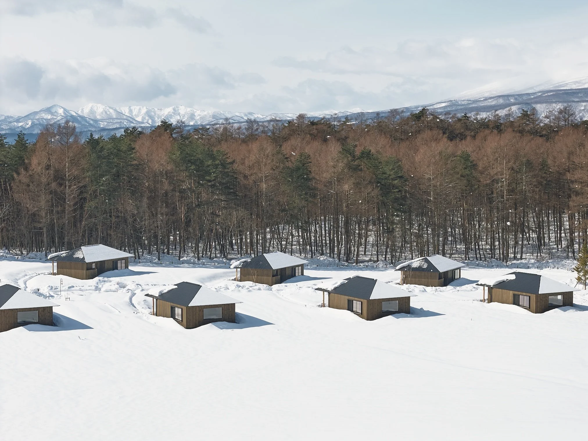 敷地内には、24室のゲストルーム、レストラン、ラウンジ、プライベートサウナなど、それぞれが独立した建物として、岩手山をのぞむ広大な自然の中に点在する。