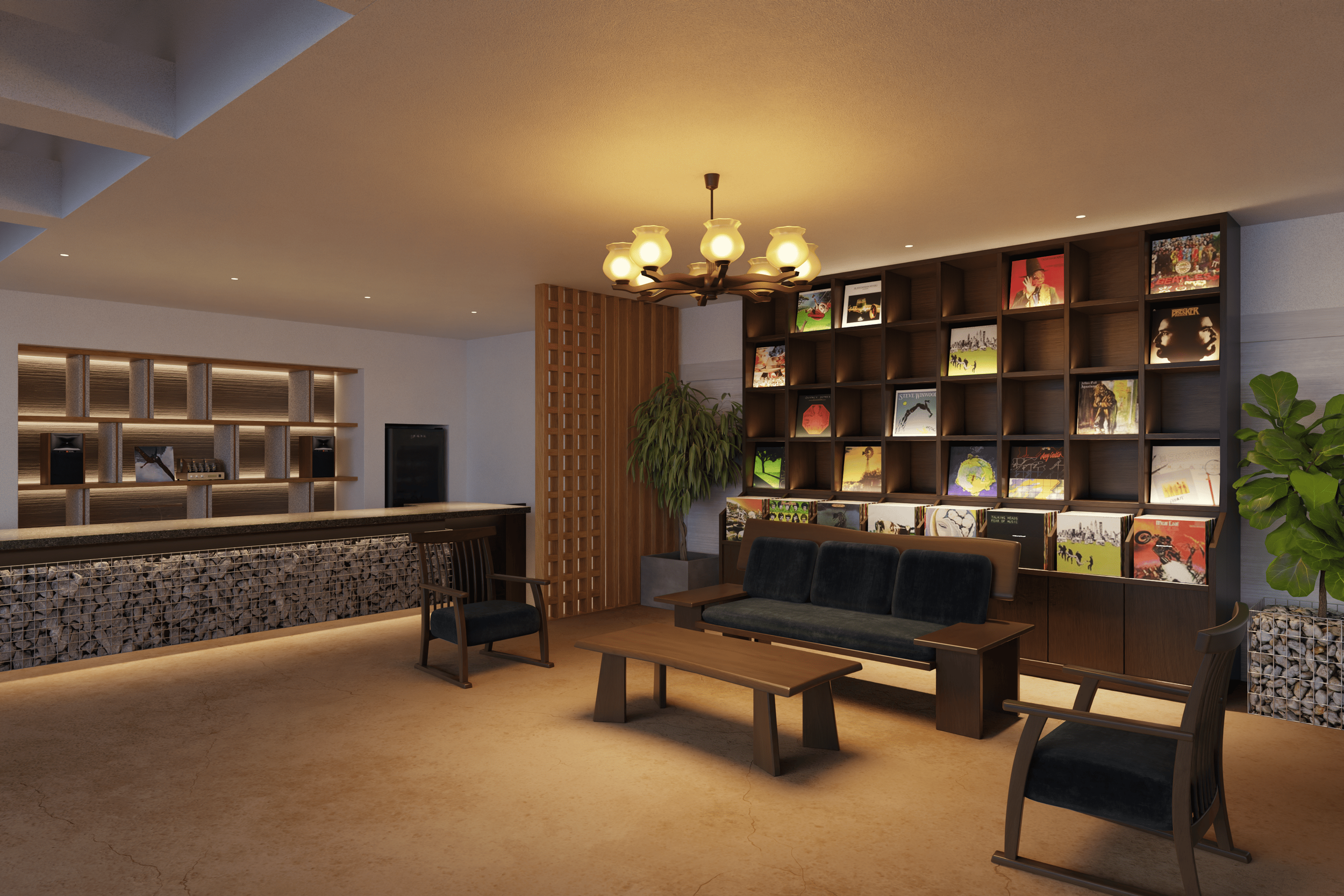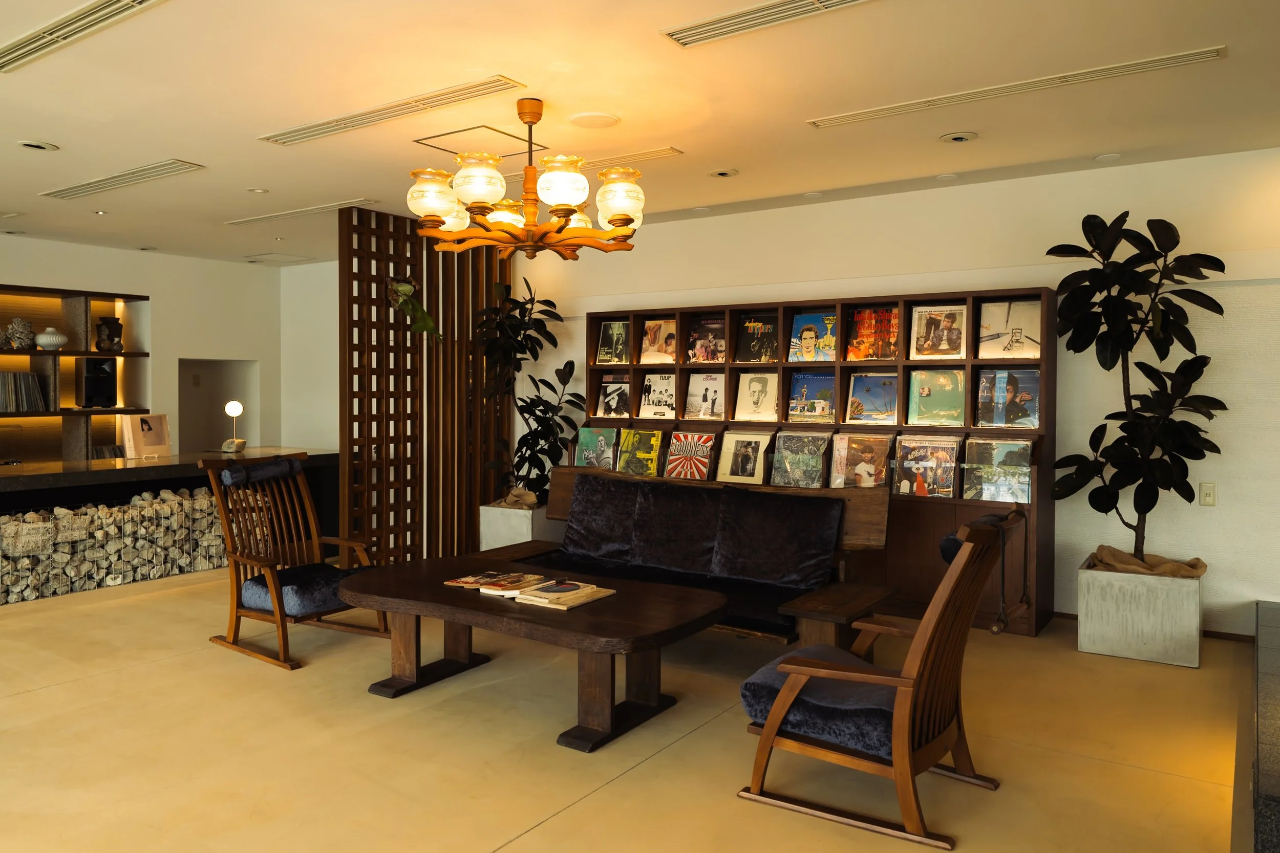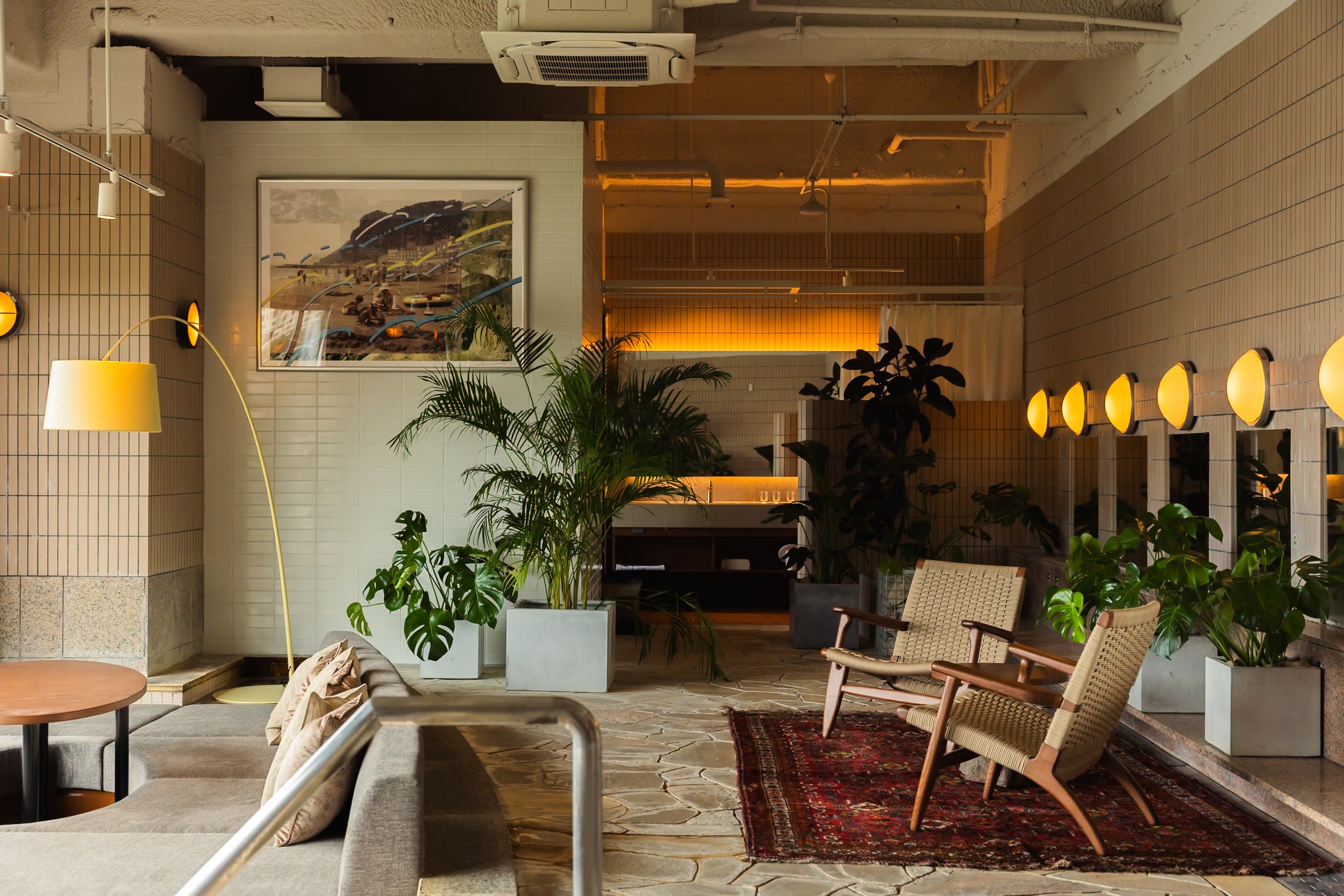 館内は、昭和期の温泉文化が色濃く残る古き良き時代の面影を大切にしながら、現代の滞在体験として再編集。旧館の素材はアートとして再配置され、熱川の最盛期に流れていたレコードコレクションや当時を思わせるポスターが空間に彩りを添える。