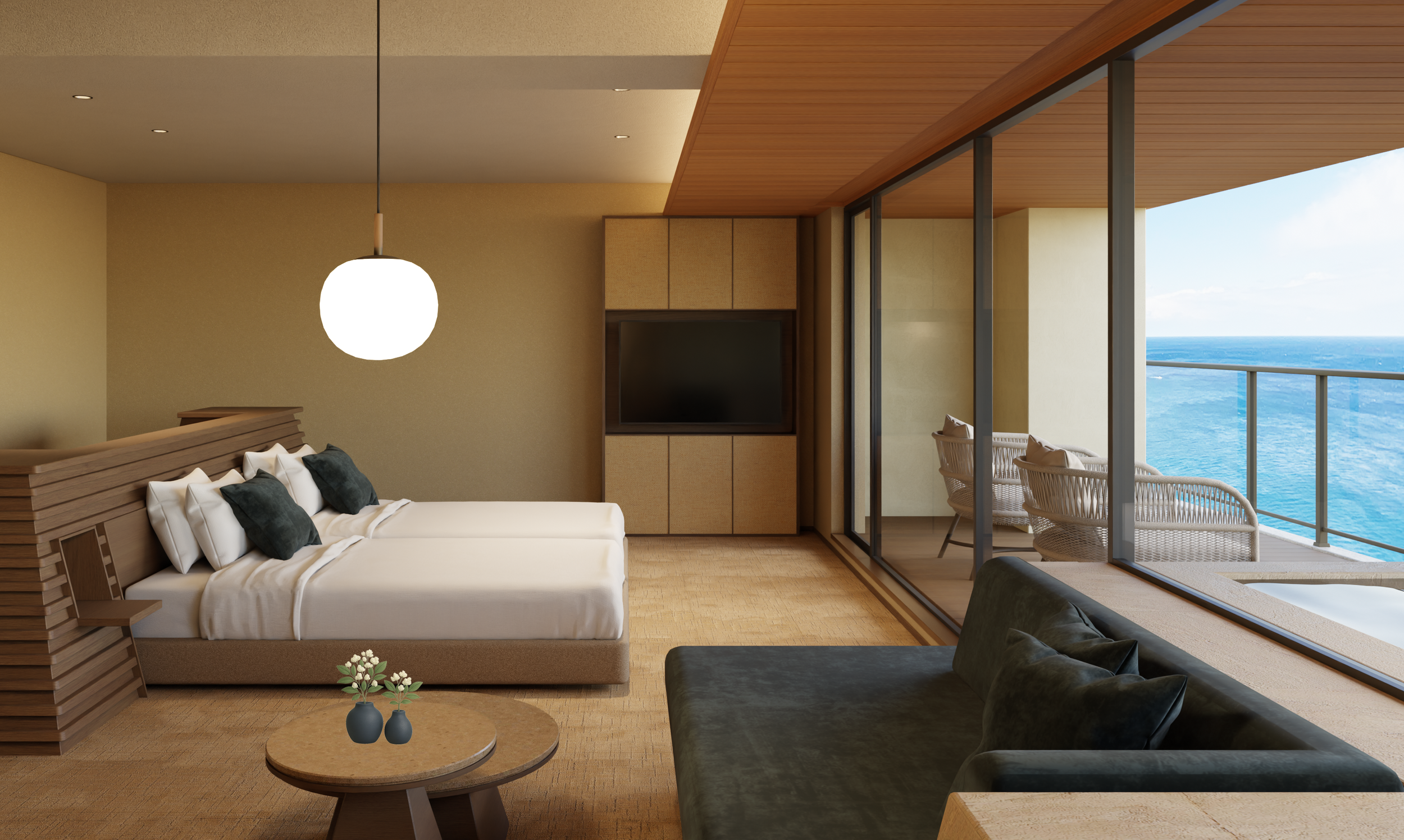 24室あった客室は、ゆとりを持たせるため16室へと再構成。すべての客室がオーシャンビューで源泉かけ流しの露天風呂を備える。観光地を巡る旅ではなく、滞在そのものを目的とする温泉リトリートを提案する。