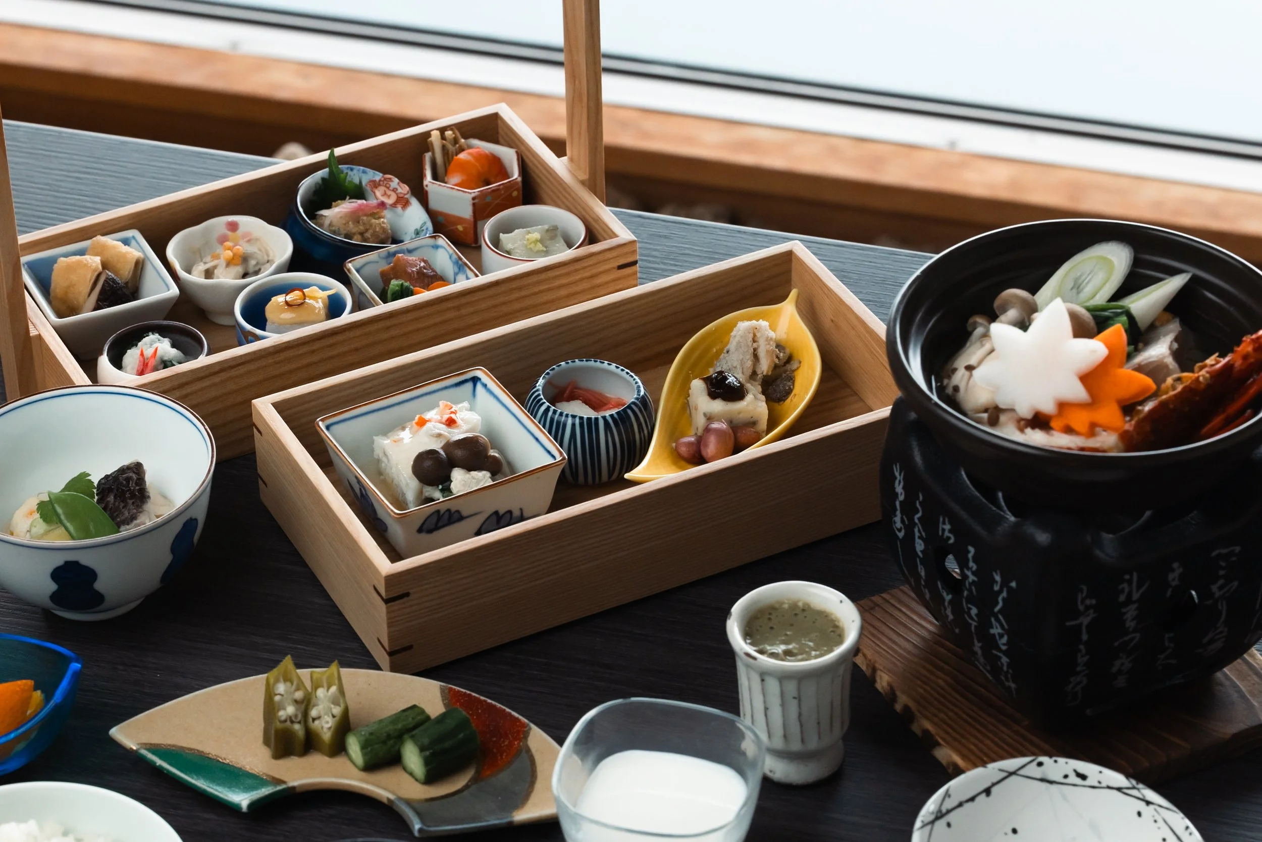 館内レストラン「汐と杯」では、伊豆の海の幸を中心とした和食を提供。金目鯛、伊勢海老、黒むつなどの地元食材を使い、郷土料理の技を活かしたメニューを展開する。ワインや地酒とのペアリングも充実し、朝食には地元野菜や発酵食材を取り入れた和朝食を用意する。