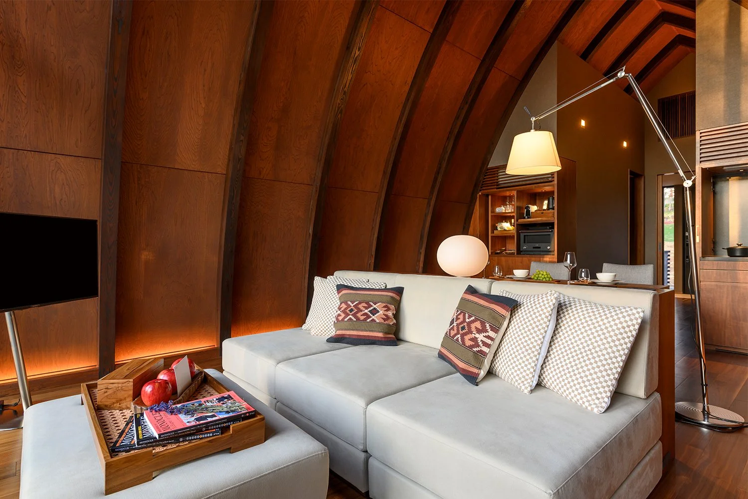 約7,000㎡の広大な敷地に、わずか6棟のみを配した贅沢な設計。すべてが1棟貸切タイプのヴィラで、ニセコの風景に溶け込むような造形美が印象的。2階のリビングスペース、1階のベッドルームのどちらからも自然を身近に感じられ、季節の移ろいを五感で味わいながら、ゆったりとした時間を過ごすことができる。